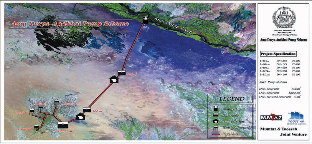 This project aims at an appropriate water distribution in Andkhoy city and consists of 62655m pipe laying with PE-100 pipes diameters of 63mm to 250mm with all joints and fittings, valves and valve chambers.